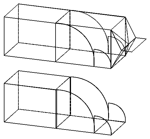 ![]() Bei dieser geöffneten Box kann man das Prinzip erkennen, wie der Deckel und seine Seitenteile geschnitten werden. Die seitlichen Viertelkreise verhindern ein Durchdrücken des Deckels nach innen. Klebe- oder Schweißverbindungen sind nicht erforderlich. Rechts ist das Schnitt- und Ritzmuster abgebildet. Die Maße richten sich natürlich nach dem jeweils verwendeten Verpackungstyp. |